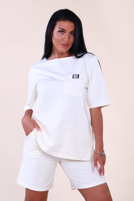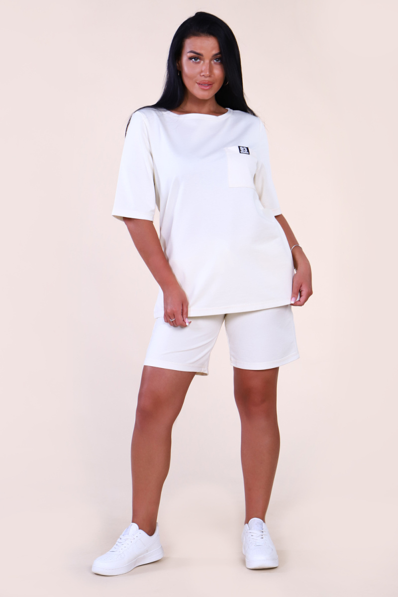 Женский костюм состоит из футболки и шорт, выполнен из мягкого и приятного на ощупь материала футер 2-х нитка. В состав входят 70% хлопка, 24% полиэстера и 6% эластана, что обеспечивает комфорт и хорошую посадку.